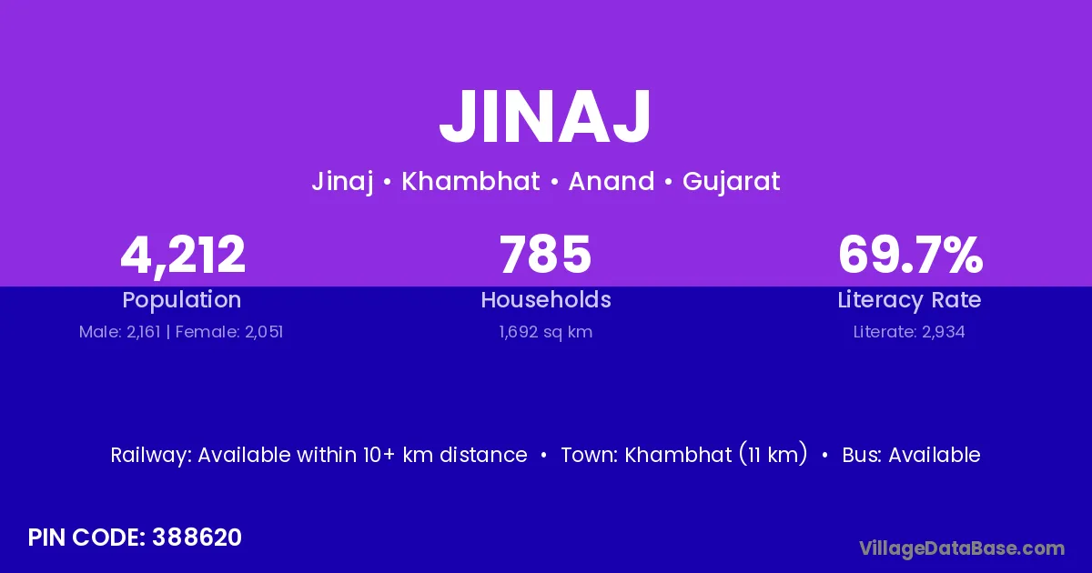 Khambhat (11 km) is the nearest town to Jinaj village for major economic activities and is located approximately 11 km away.