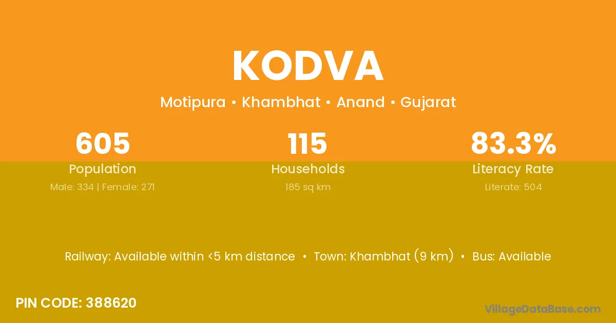 Khambhat (9 km) is the nearest town to Kodva village for major economic activities and is located approximately 9 km away.