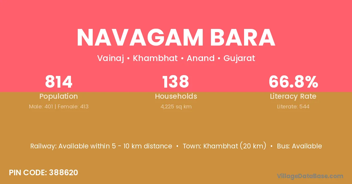 Khambhat (20 km) is the nearest town to Navagam Bara village for major economic activities and is located approximately 20 km away.
