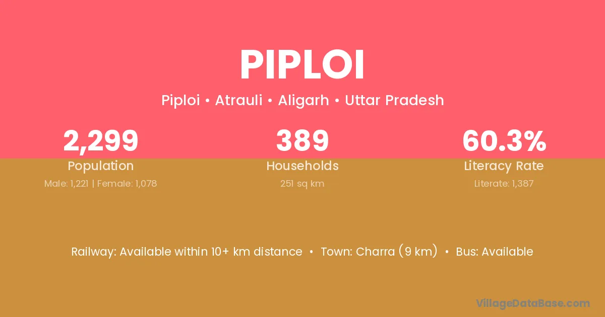 The literacy rate of Piploi village is 73.06%. Male literacy stands at 79.85% and female literacy at 65.81%.