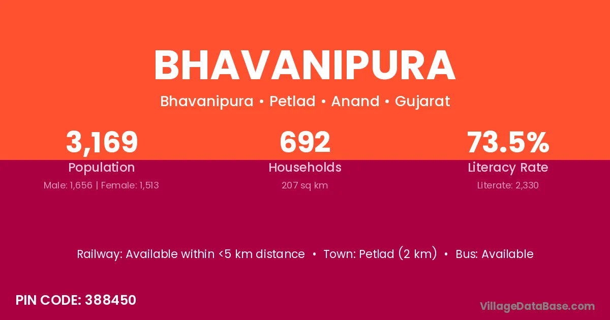 Petlad (2 km) is the nearest town to Bhavanipura village for major economic activities and is located approximately 2 km away.