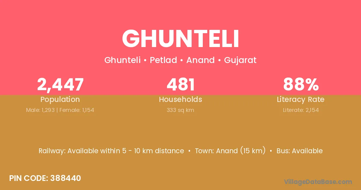Anand (15 km) is the nearest town to Ghunteli village for major economic activities and is located approximately 15 km away.