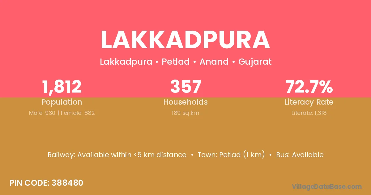 Petlad (1 km) is the nearest town to Lakkadpura village for major economic activities and is located approximately 1 km away.