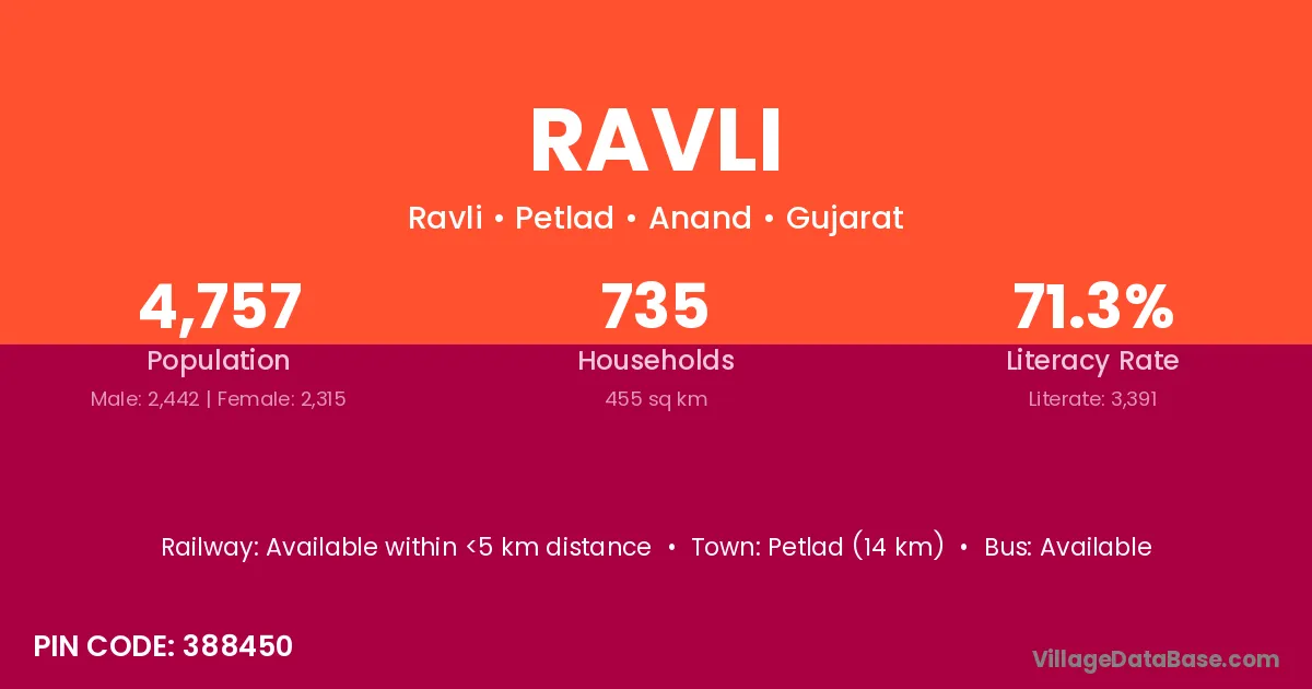 Petlad (14 km) is the nearest town to Ravli village for major economic activities and is located approximately 14 km away.
