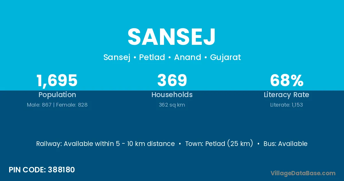 Petlad (25 km) is the nearest town to Sansej village for major economic activities and is located approximately 25 km away.
