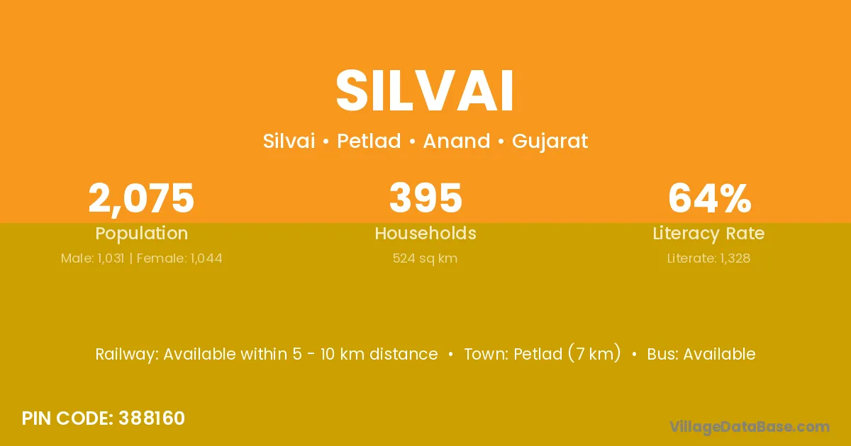 Petlad (7 km) is the nearest town to Silvai village for major economic activities and is located approximately 7 km away.
