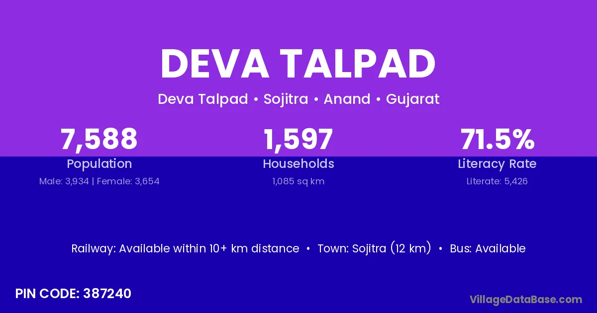 Sojitra (12 km) is the nearest town to Deva Talpad village for major economic activities and is located approximately 12 km away.