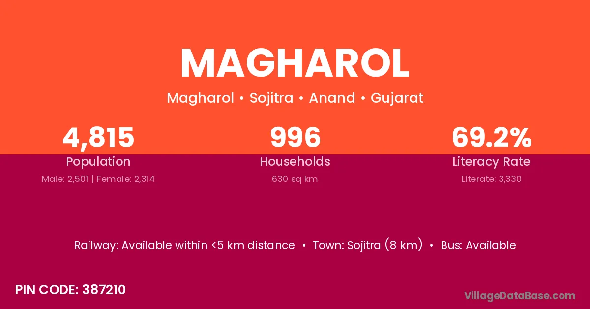 Sojitra (8 km) is the nearest town to Magharol village for major economic activities and is located approximately 8 km away.