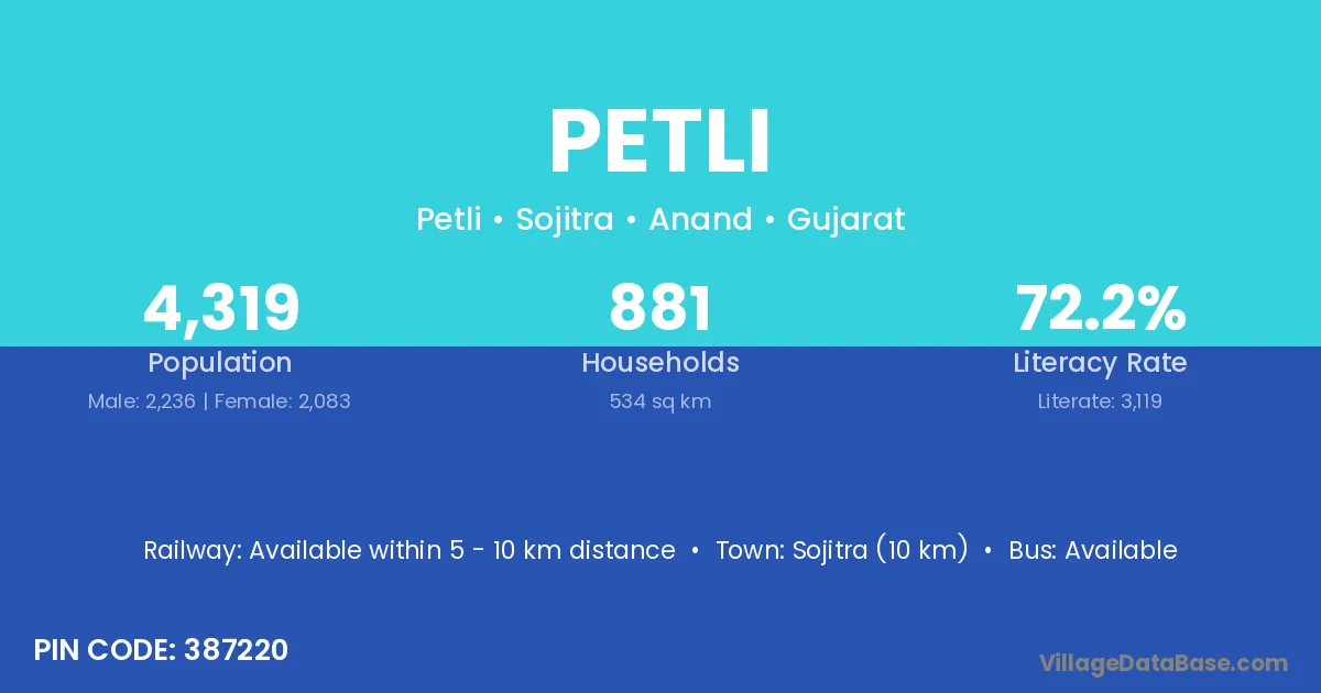 Sojitra (10 km) is the nearest town to Petli village for major economic activities and is located approximately 10 km away.