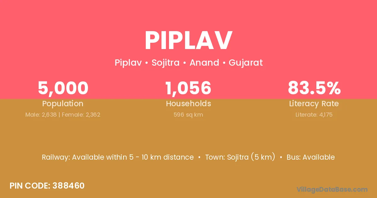 Sojitra (5 km) is the nearest town to Piplav village for major economic activities and is located approximately 5 km away.