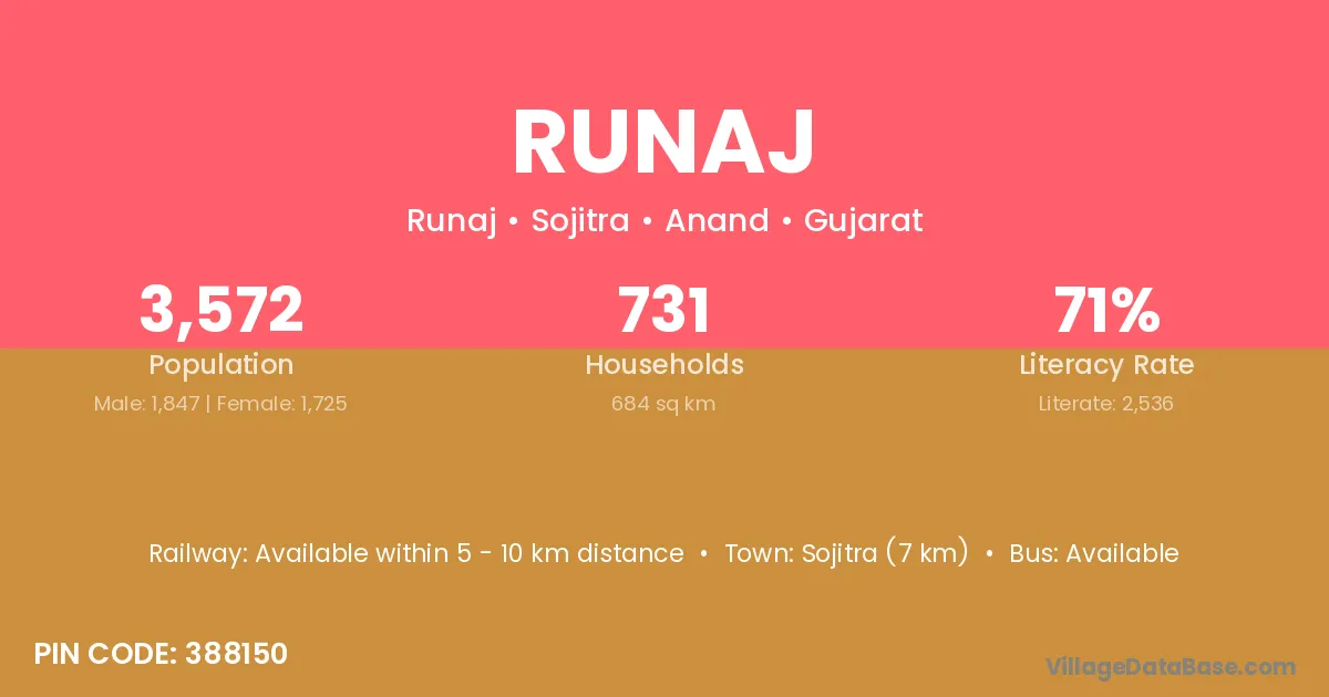 Sojitra (7 km) is the nearest town to Runaj village for major economic activities and is located approximately 7 km away.