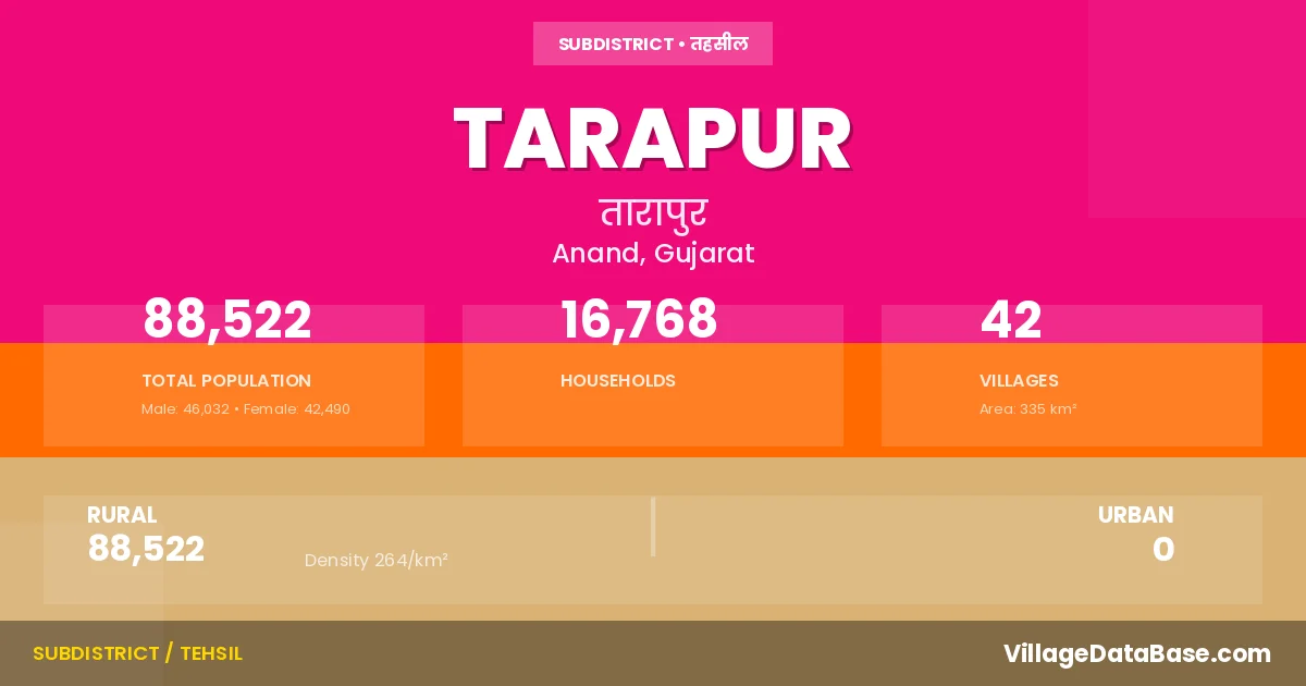 According to the 2011 census The total area of Tarapur Taluka is 335 km², with a population of 88522 people. The population density is 264 inhabitants per square kilometre, and there are approximately 16768 houses in the sub district.