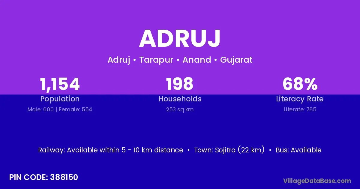 Sojitra (22 km) is the nearest town to Adruj village for major economic activities and is located approximately 22 km away.