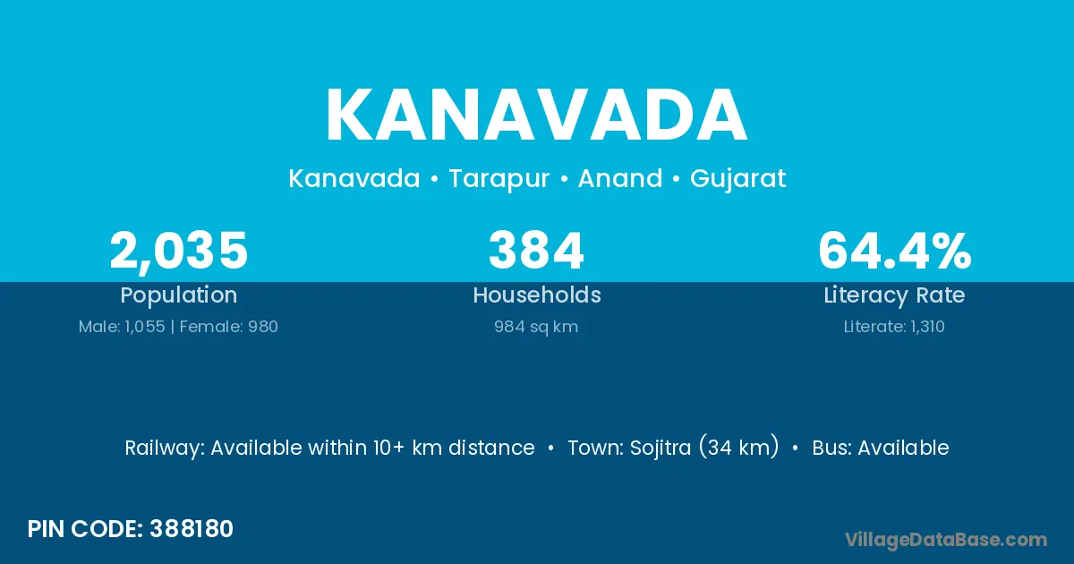 Sojitra (34 km) is the nearest town to Kanavada village for major economic activities and is located approximately 34 km away.