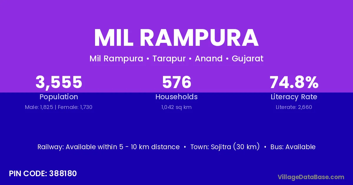 Sojitra (30 km) is the nearest town to Mil Rampura village for major economic activities and is located approximately 30 km away.