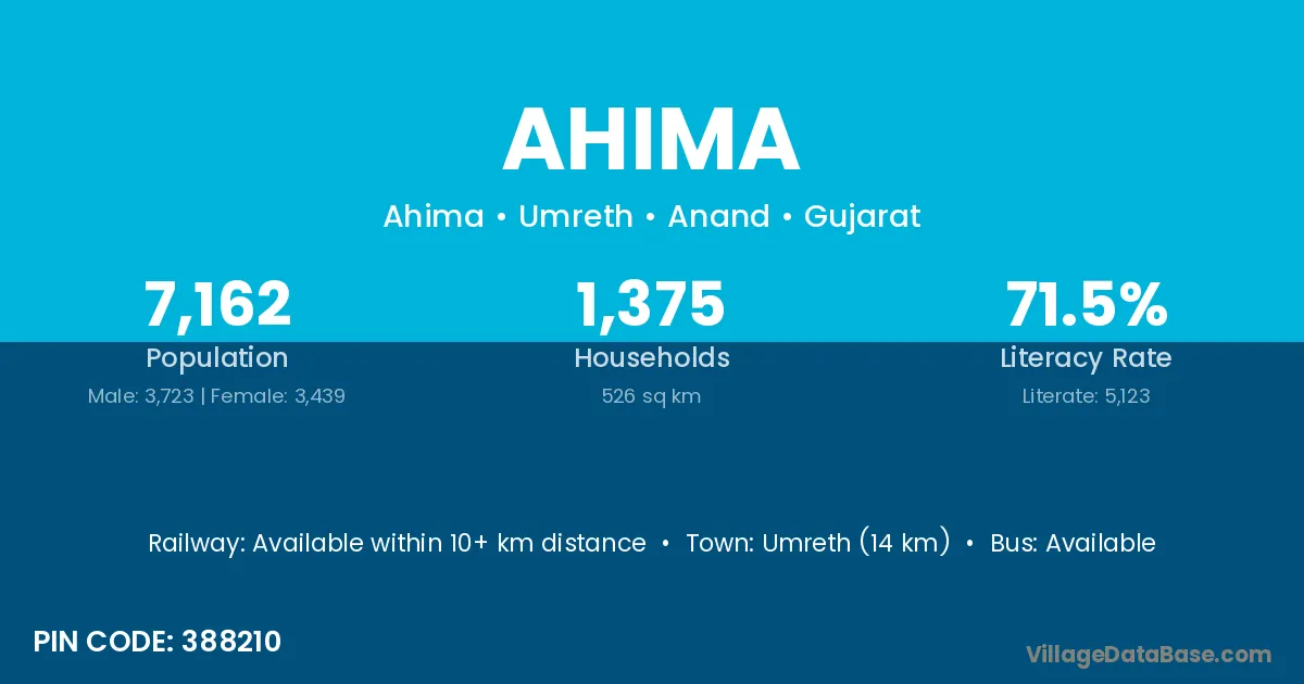 Umreth (14 km) is the nearest town to Ahima village for major economic activities and is located approximately 14 km away.