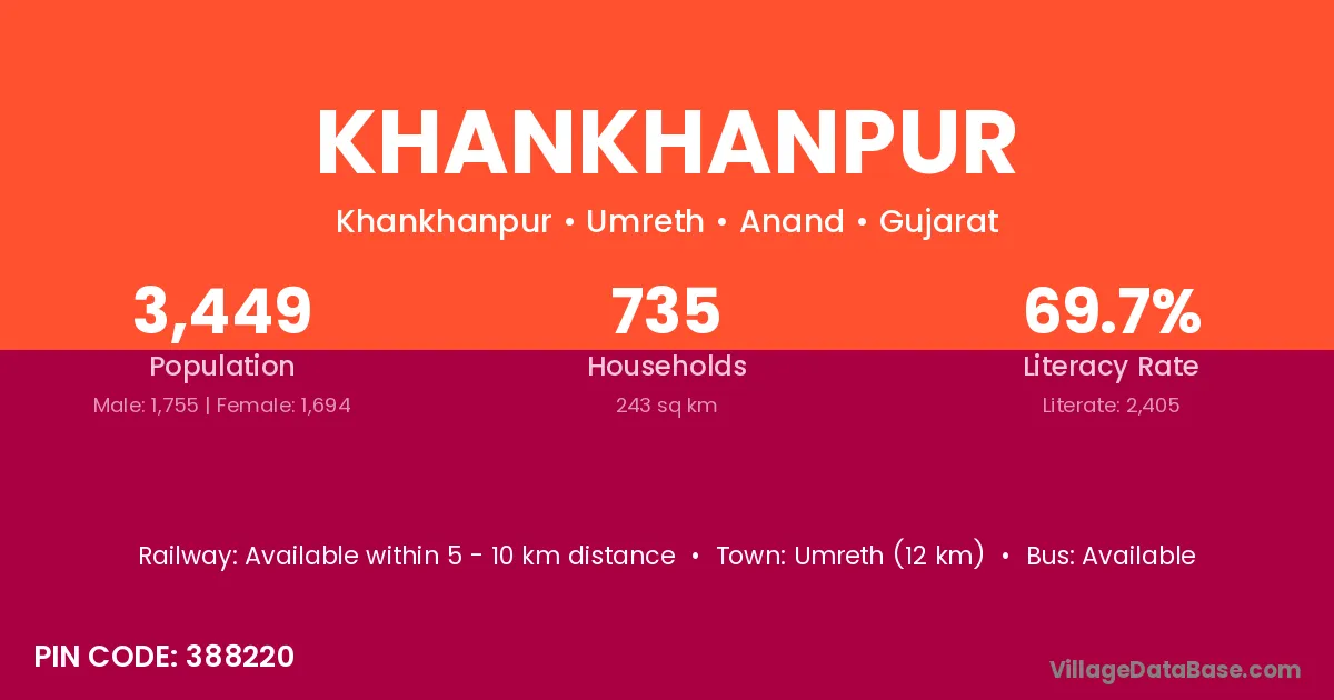 Umreth (12 km) is the nearest town to Khankhanpur village for major economic activities and is located approximately 12 km away.