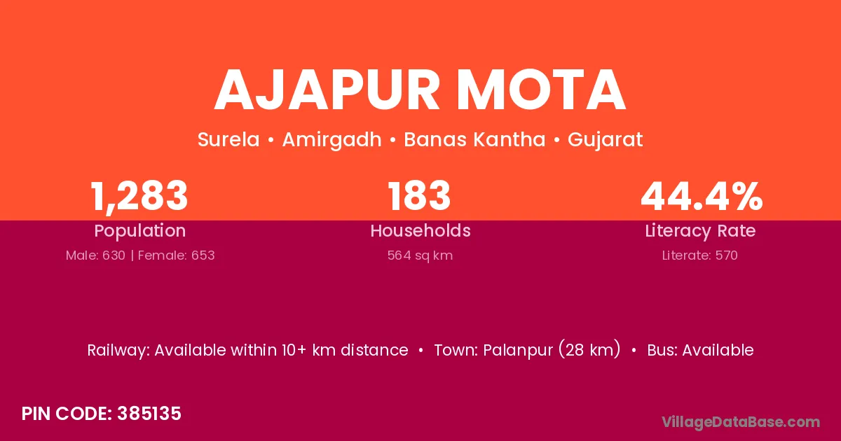 Ajapur Mota village has a total population of 1,283 people, of which 630 are males and 653 are females.
