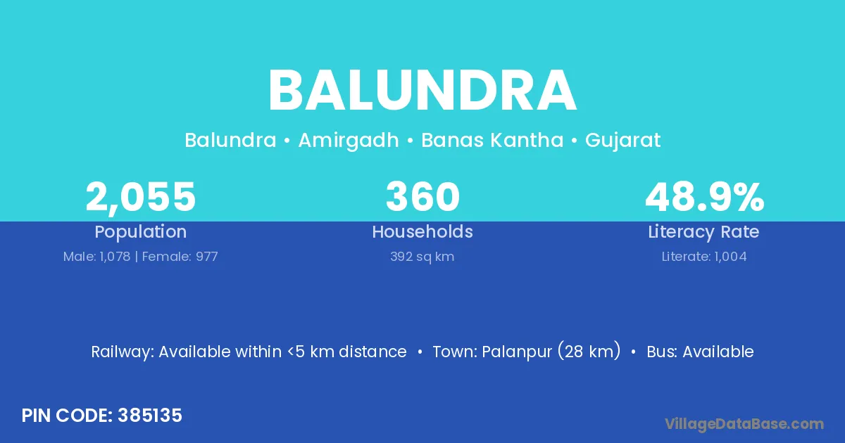 Palanpur (28 km) is the nearest town to Balundra village for major economic activities and is located approximately 28 km away.