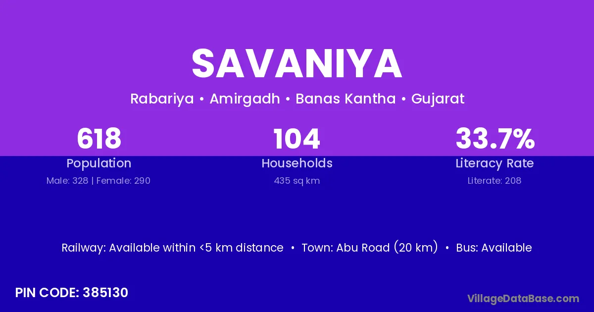 Abu Road (20 km) is the nearest town to Savaniya village for major economic activities and is located approximately 20 km away.