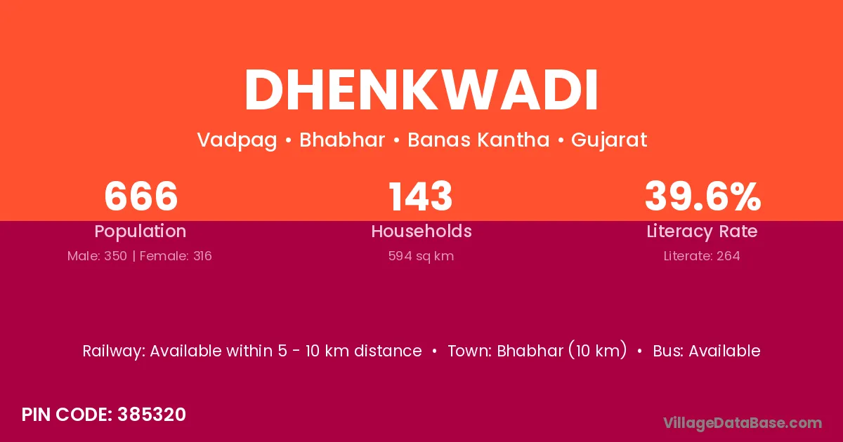 Bhabhar (10 km) is the nearest town to Dhenkwadi village for major economic activities and is located approximately 10 km away.