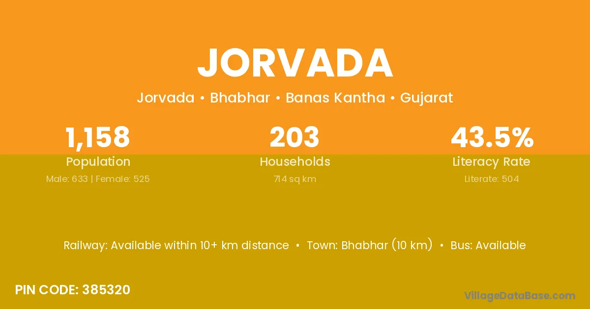 Bhabhar (10 km) is the nearest town to Jorvada village for major economic activities and is located approximately 10 km away.