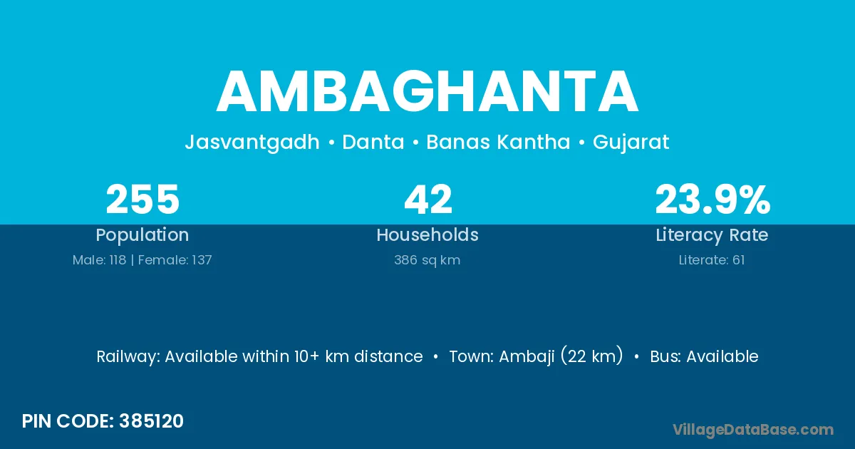 Ambaji (22 km) is the nearest town to Ambaghanta village for major economic activities and is located approximately 22 km away.