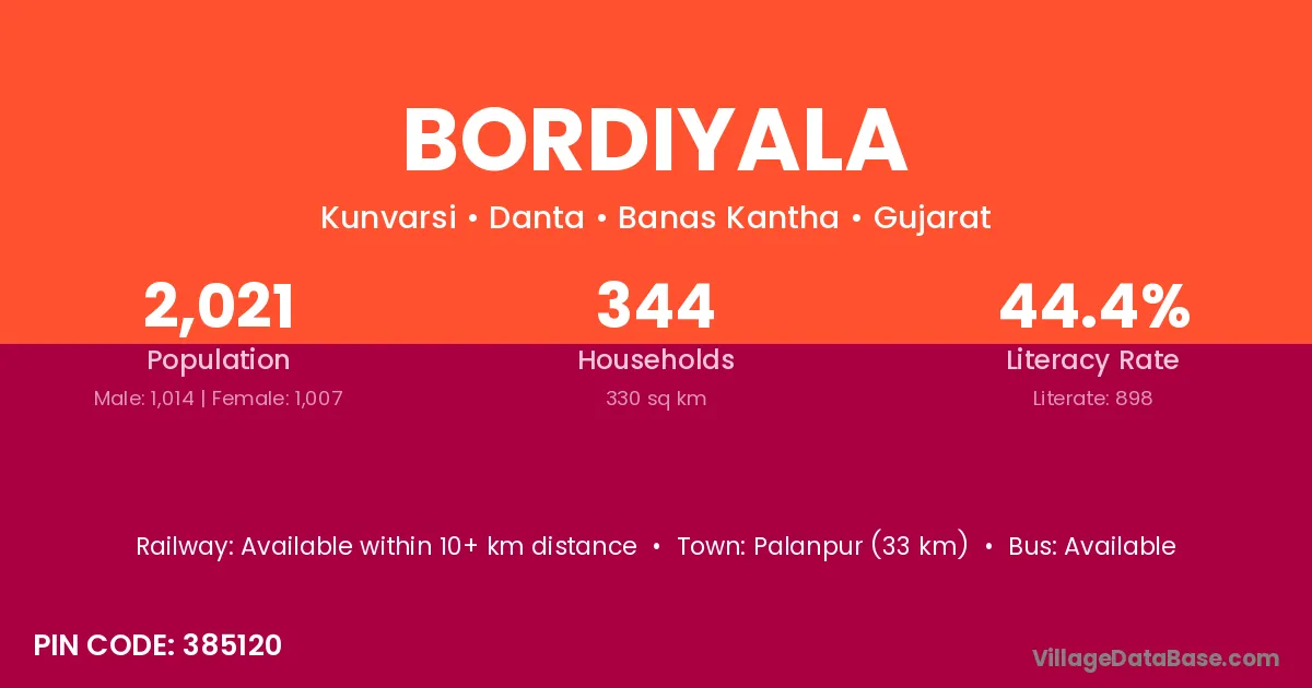 Palanpur (33 km) is the nearest town to Bordiyala village for major economic activities and is located approximately 33 km away.