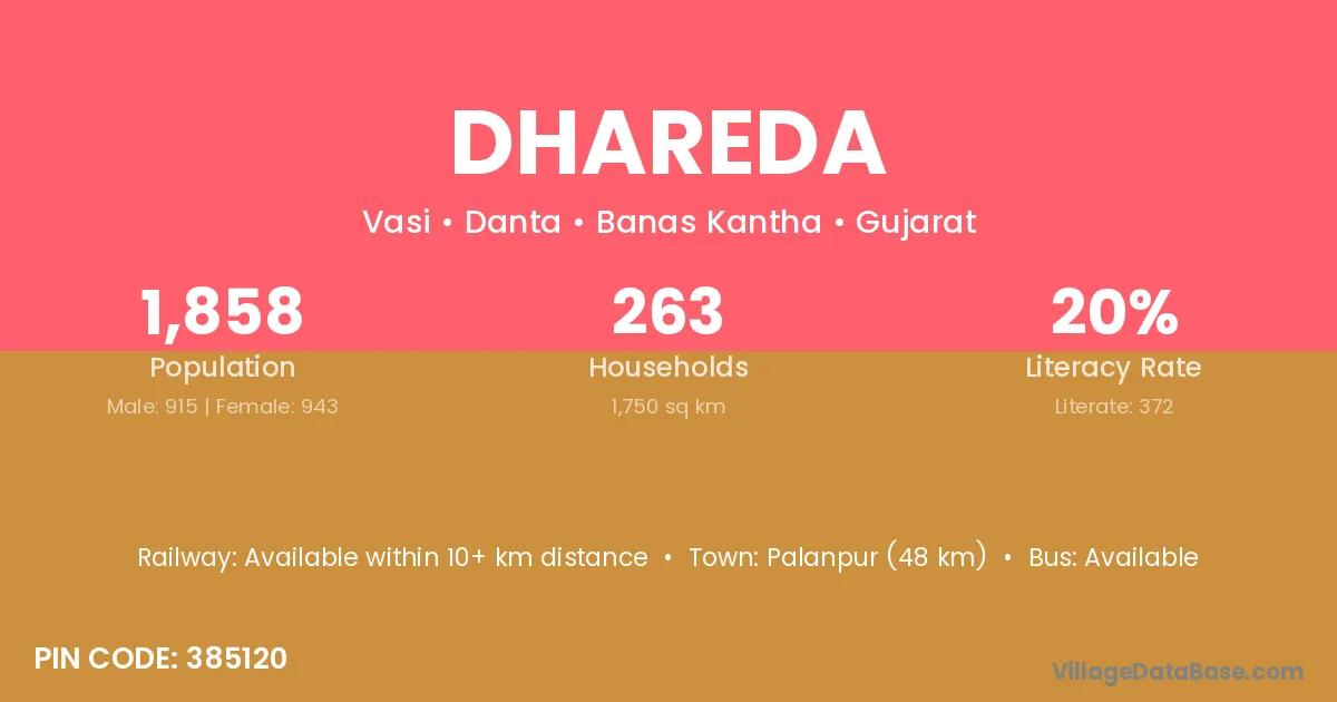 Palanpur (48 km) is the nearest town to Dhareda village for major economic activities and is located approximately 48 km away.