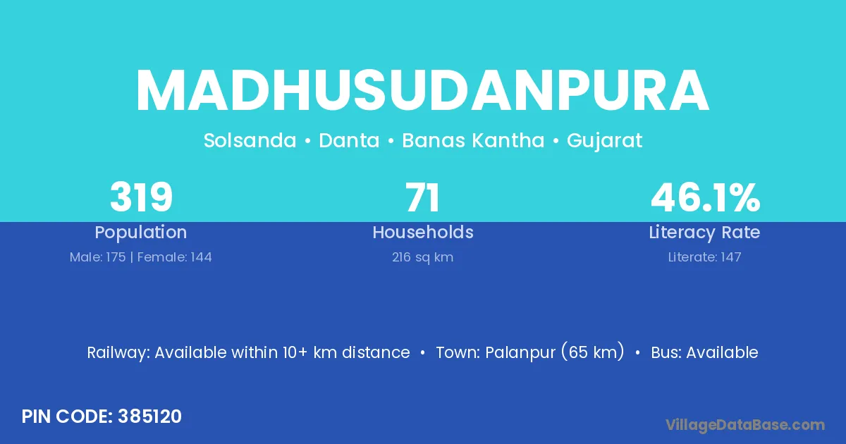 Palanpur (65 km) is the nearest town to Madhusudanpura village for major economic activities and is located approximately 65 km away.