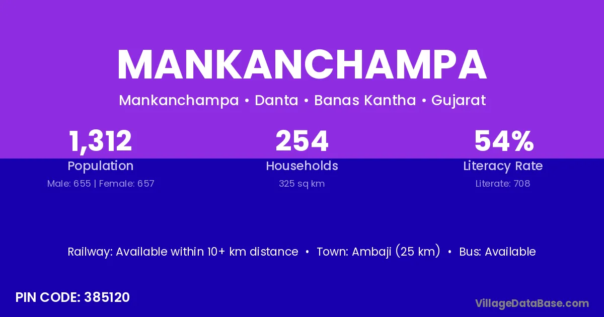 Ambaji (25 km) is the nearest town to Mankanchampa village for major economic activities and is located approximately 25 km away.