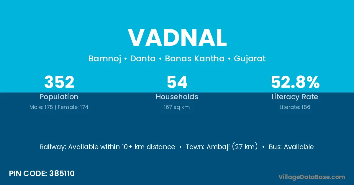 Ambaji (27 km) is the nearest town to Vadnal village for major economic activities and is located approximately 27 km away.