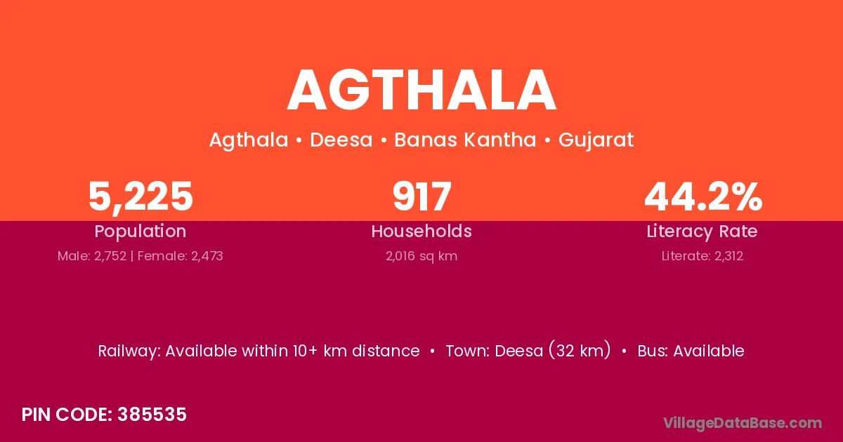 Deesa (32 km) is the nearest town to Agthala village for major economic activities and is located approximately 32 km away.