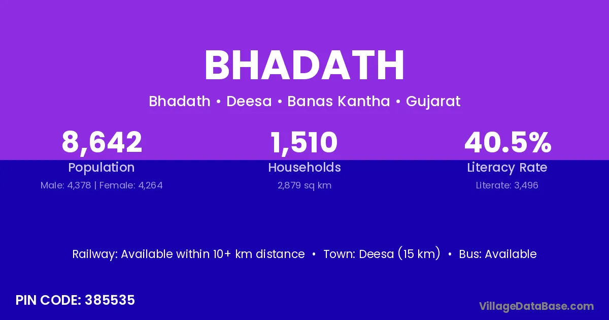 Deesa (15 km) is the nearest town to Bhadath village for major economic activities and is located approximately 15 km away.