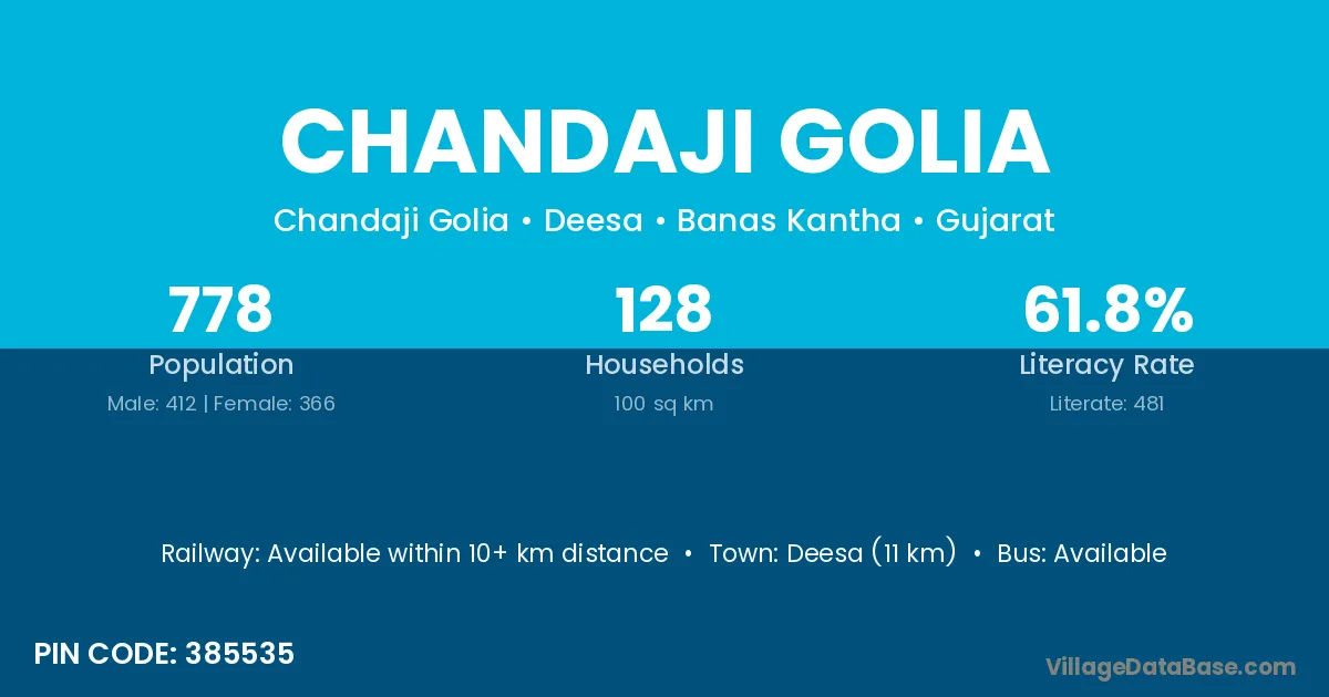 Deesa (11 km) is the nearest town to Chandaji Golia village for major economic activities and is located approximately 11 km away.