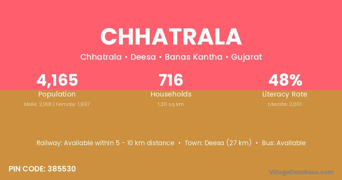 Deesa (27 km) is the nearest town to Chhatrala village for major economic activities and is located approximately 27 km away.
