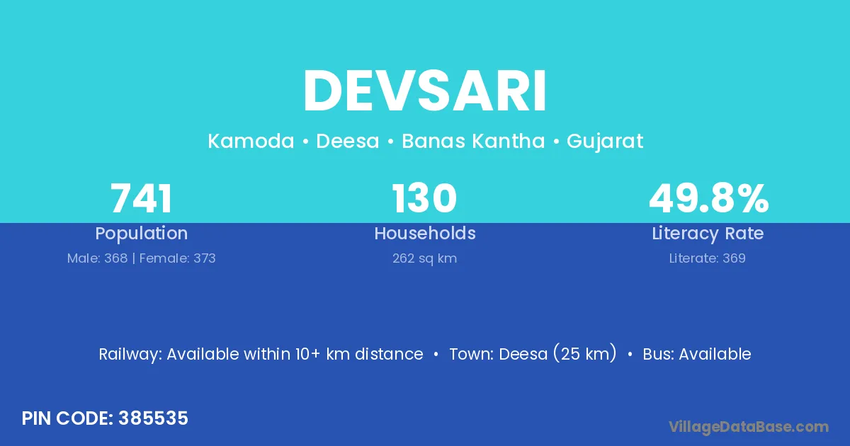 Deesa (25 km) is the nearest town to Devsari village for major economic activities and is located approximately 25 km away.