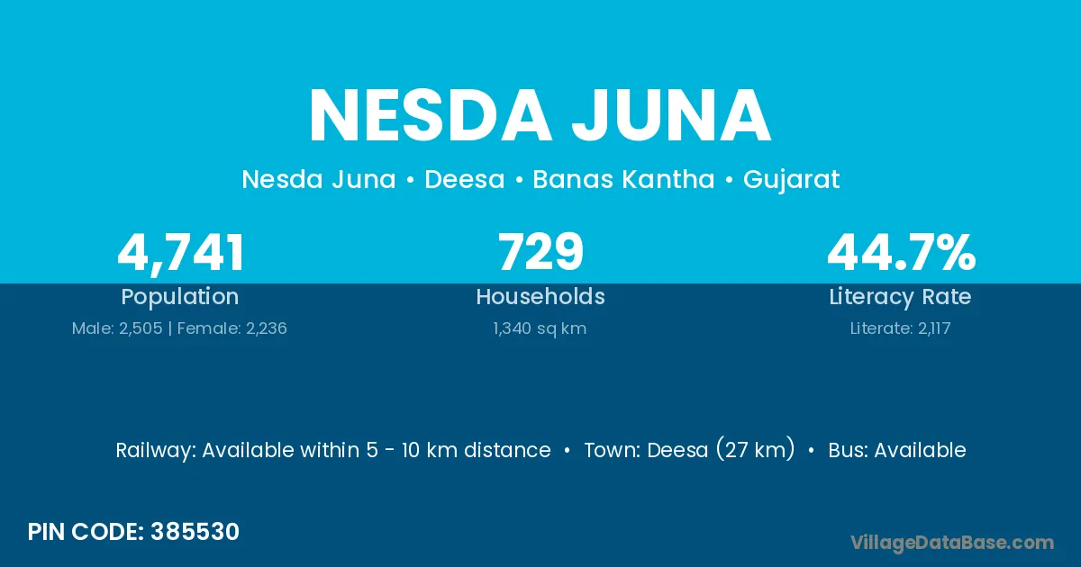 Deesa (27 km) is the nearest town to Nesda Juna village for major economic activities and is located approximately 27 km away.