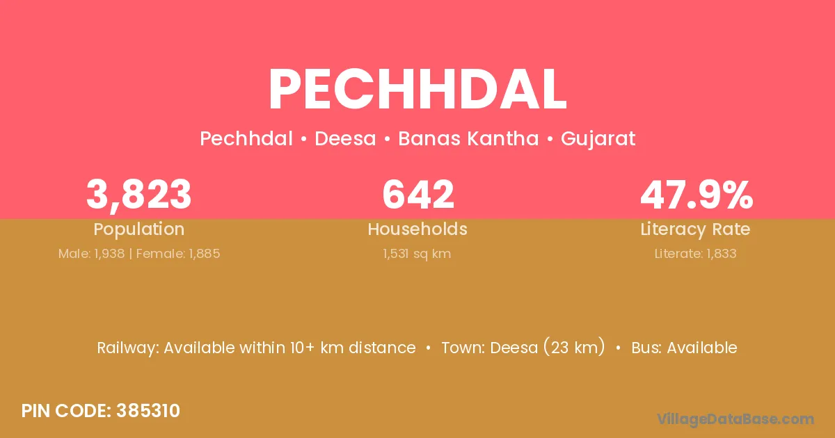 Deesa (23 km) is the nearest town to Pechhdal village for major economic activities and is located approximately 23 km away.
