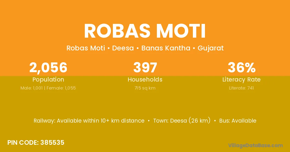 Deesa (26 km) is the nearest town to Robas Moti village for major economic activities and is located approximately 26 km away.