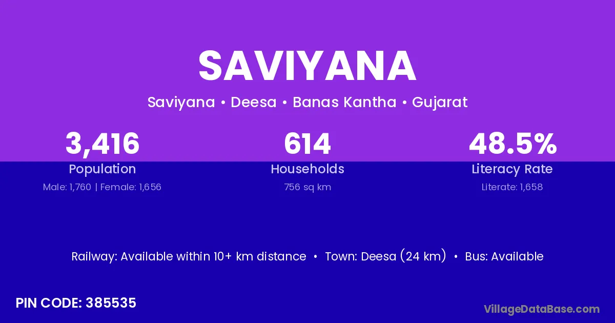 Deesa (24 km) is the nearest town to Saviyana village for major economic activities and is located approximately 24 km away.