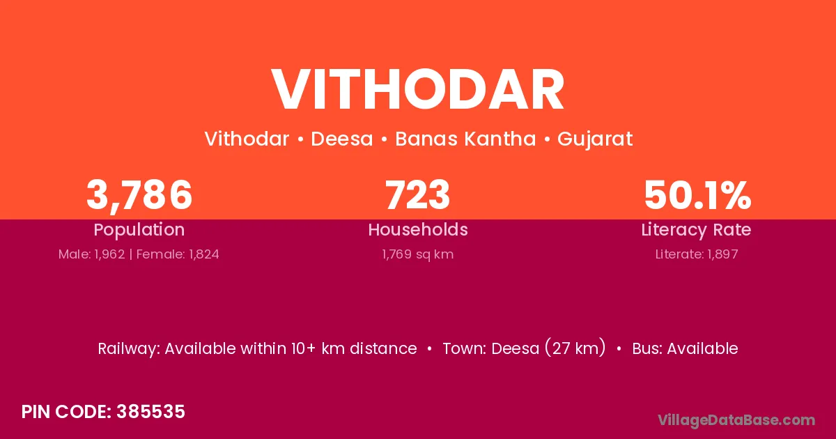 Deesa (27 km) is the nearest town to Vithodar village for major economic activities and is located approximately 27 km away.