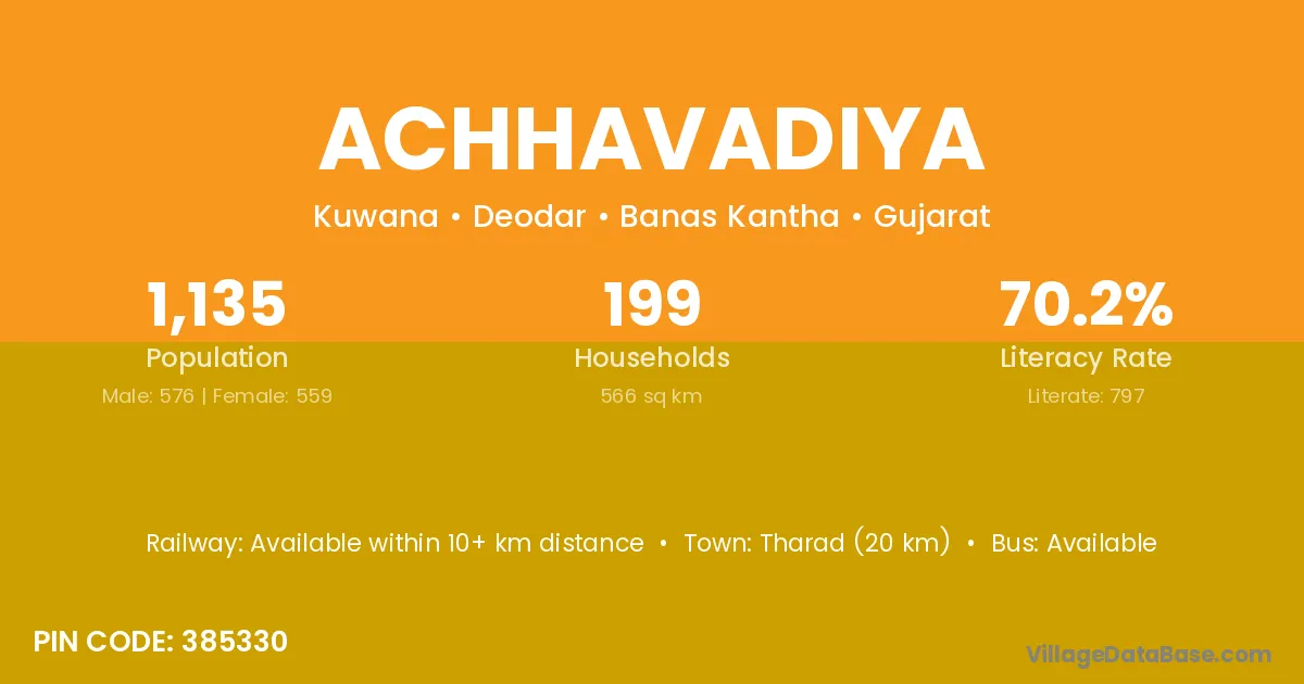 Tharad (20 km) is the nearest town to Achhavadiya village for major economic activities and is located approximately 20 km away.