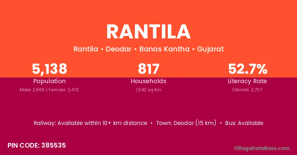 Deodar (15 km) is the nearest town to Rantila village for major economic activities and is located approximately 15 km away.