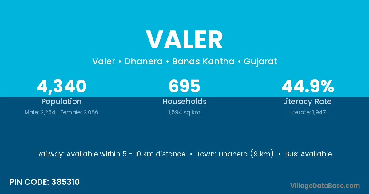 Dhanera (9 km) is the nearest town to Valer village for major economic activities and is located approximately 9 km away.