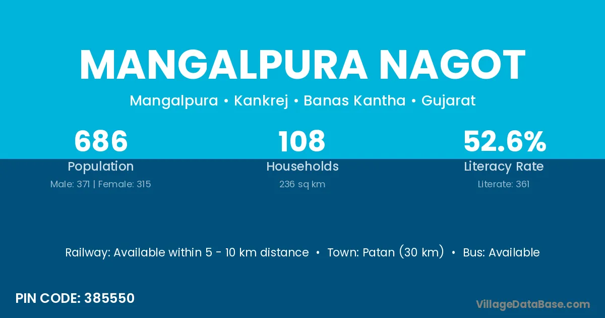 Patan (30 km) is the nearest town to Mangalpura Nagot village for major economic activities and is located approximately 30 km away.