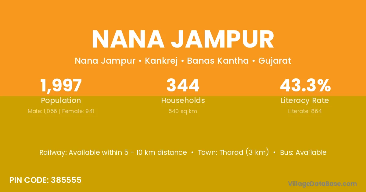 Tharad (3 km) is the nearest town to Nana Jampur village for major economic activities and is located approximately 3 km away.