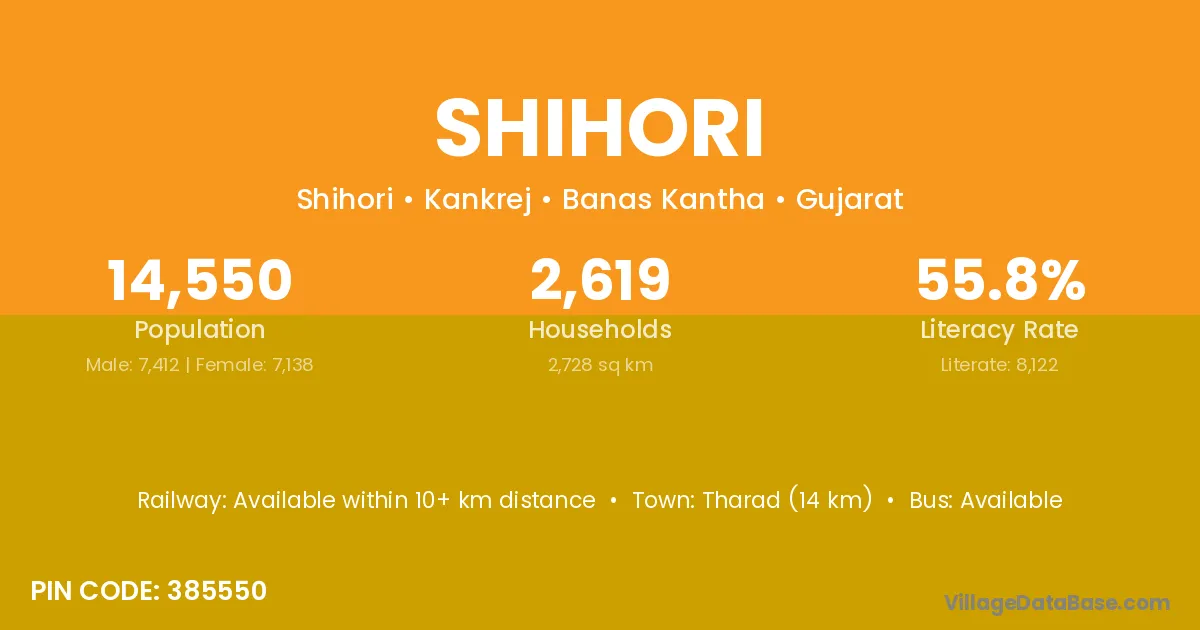 Tharad (14 km) is the nearest town to Shihori village for major economic activities and is located approximately 14 km away.