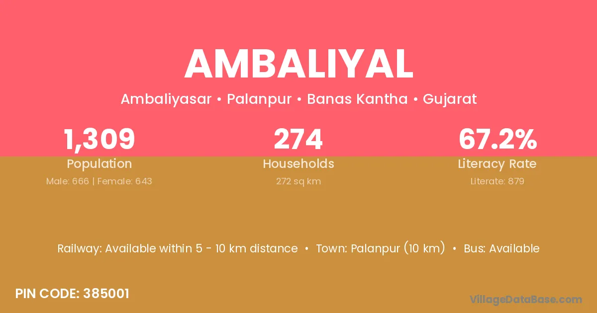 Palanpur (10 km) is the nearest town to Ambaliyal village for major economic activities and is located approximately 10 km away.