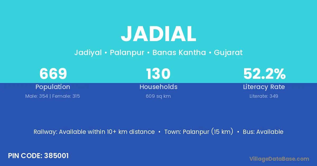Palanpur (15 km) is the nearest town to Jadial village for major economic activities and is located approximately 15 km away.